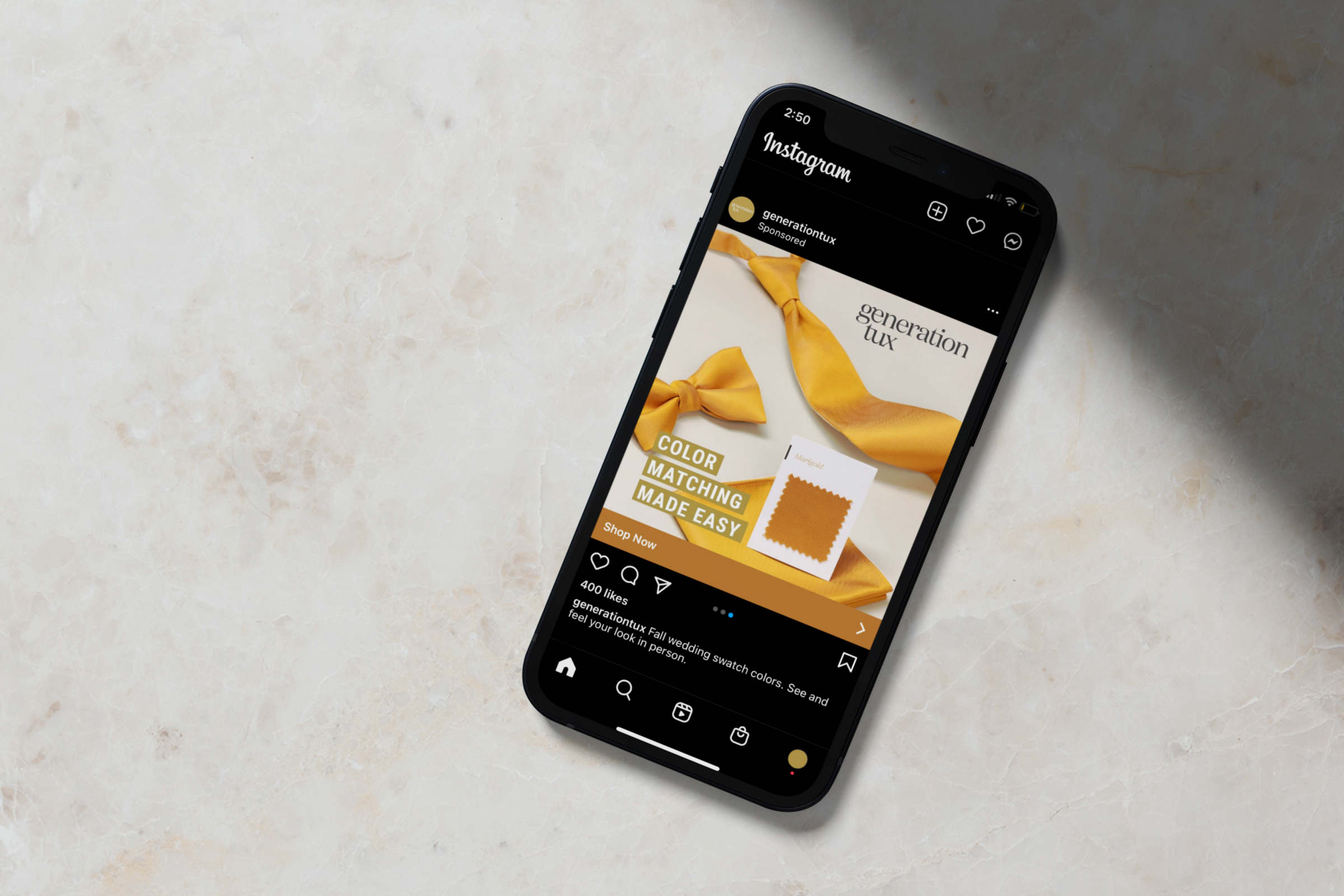 The Goal of the Accessory Swatch Campaign was to draw awareness to the hundreds of accessories Generation Tux offers. The purpose was to highlight how easy color matching is when you use GT’s Free Swatches. By showcasing swatch colors through a romanticized layout of all the accessories in that color, I was able to communicate the ease of the process and the wide range of products available to customize your rental.